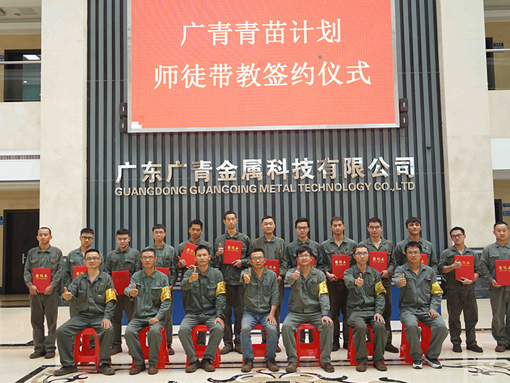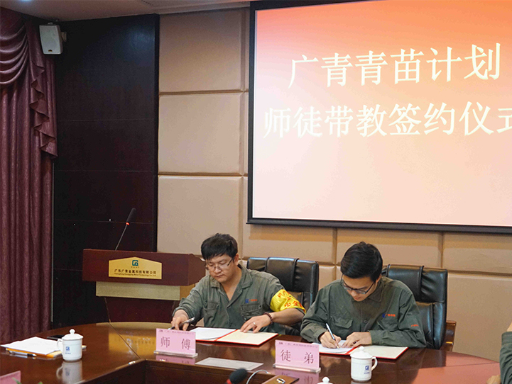 9月3日,广东广青金属科技有限公司“青苗计划”启动仪式暨师徒带教签约仪式在公司办公楼一楼会议室举行。公司党委副书记江华革,副总经理刘光勇,各厂厂长以及项目有关负责人出席了活动。
