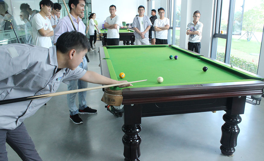 比赛中,只见球桌上精彩不断,直拍、横拍、扣球、旋转球、弧线球等精彩扣杀、绝妙回挡时时呈现。乒乓球在球桌上快速地旋转飞梭,羽毛球赛场外呐喊声和欢呼声此起彼伏,非常热闹,台球桌上选手屏气凝神一杆进洞。
