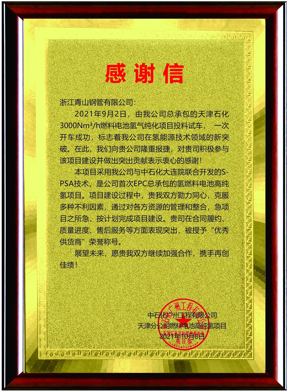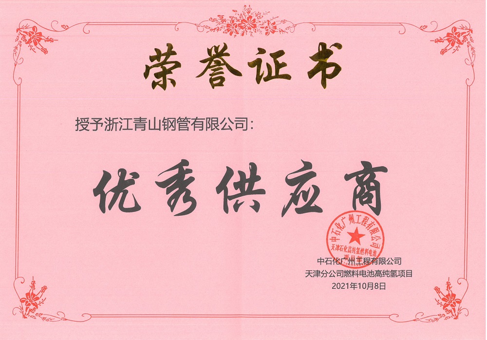 12月11日,浙江壹号娱乐-com钢管有限公司荣获中石化广州工程有限公司“优秀供应商”荣誉称号,并且收到了来自中石化广州工程有限公司天津分公司燃料电池高纯氢项目的感谢信。
