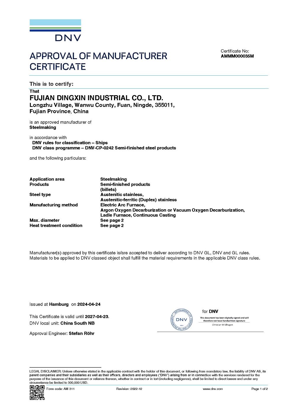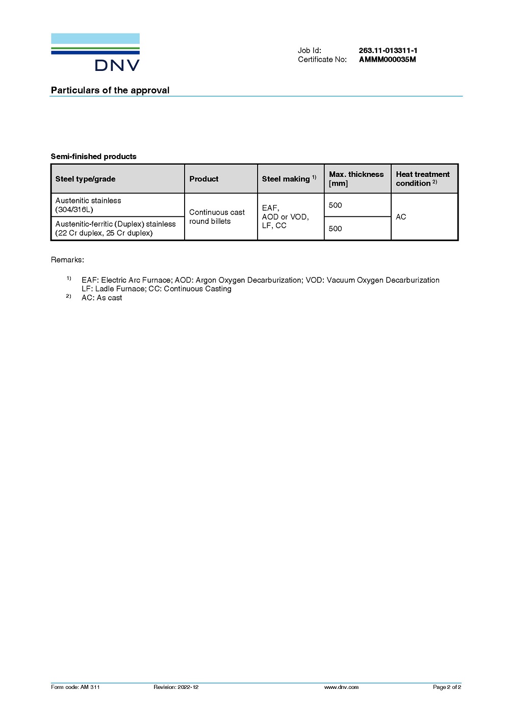 本次认证产品为不锈钢连铸圆坯,牌号覆盖304、316L、2205、2507等,最大直径规格500mm,多用于船用钢管及法兰等配件制造。DNV审核组通过严格的资料审查、生产跟踪、产品试验等验证程序,对公司的生产管理和质量管控体系给予了充分肯定,对技术的先进性和测试可靠性表示认可,所生产的不锈钢连铸圆坯质量可靠、稳定,符合挪威船级社材料规范的要求。